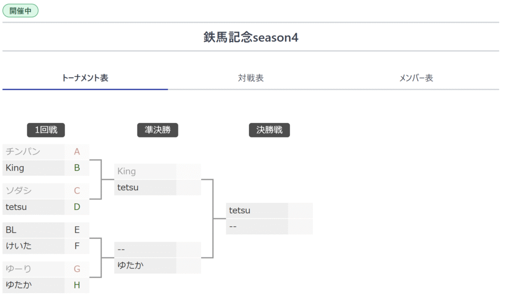 | 対戦日 | 位置 | プレイヤー名 | スコア | 勝敗 |